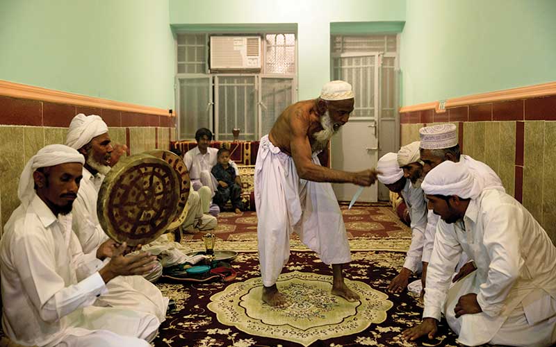 دستها را بر سینه میگذارند. پیرمرد لاغراندامی آمده وسط با چاقویی در دست و حرکاتی نمایشی. حرکات بدن با موسیقی هماهنگ است. تکرار و تکرار و از خود بیخودی. چند دانه زغال روی لبها میگذارد و تاب میخورد. «بعضی زاریها به گونهای از خودبیخود میشوند که ناگهان بهپا میخیزند و آوازی میخوانند که پیش از این نمیدانستند.»