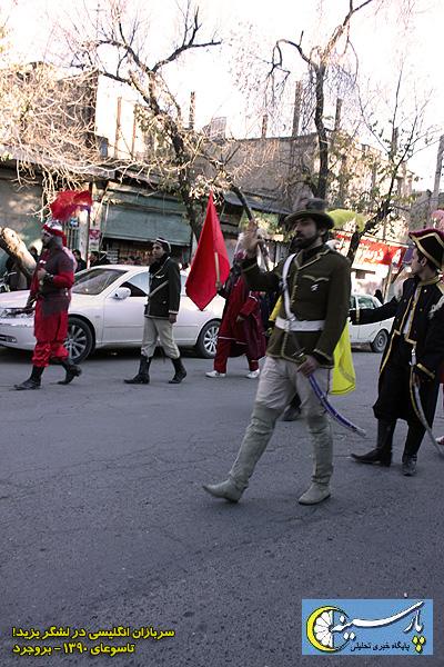 پارسینه: در رویدادی بی سابقه و قابل تامل در تعزیه امروز تاسوعای حسینی در شهرستان بروجرد در استان لرستان، عده ای از لشگریان عمرسعد، لباس و کلاه انگلیسی در قرن نوزدهم داشتند.مراسم تعزیه و دیگر مراسم آئینی عاشورایی مانند گل مالی، قدمتی طولانی در لرستان و بروجرد دارد اما این نخستین بار است که سربازان لشگر اشقیاء در تعزیه، لباس و کلاهی به غیر از لباس جنگی اعراب و رنگ مرسوم قرمز به تن دارند.