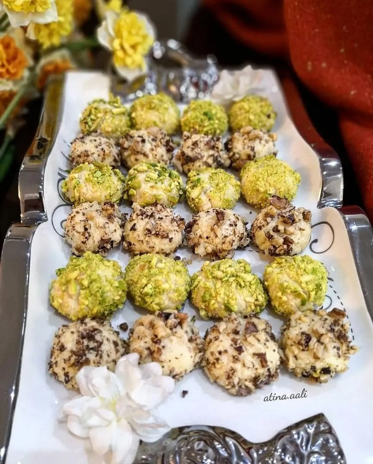 سپس خمیر را در دستتان گرد کنید. تقریبا با این مقدار خمیر 27 عدد شیرینی درست خواهد شد. حال سفیده تخم مرغ را بزنید، البته فقط در حدی که از حالت لختگی در بیاید. سپس خمیرهای گلوله شده را ابتدا در سفیده تخم مرغ بزنید و بعد در پسته یا گردو بغلطانید.