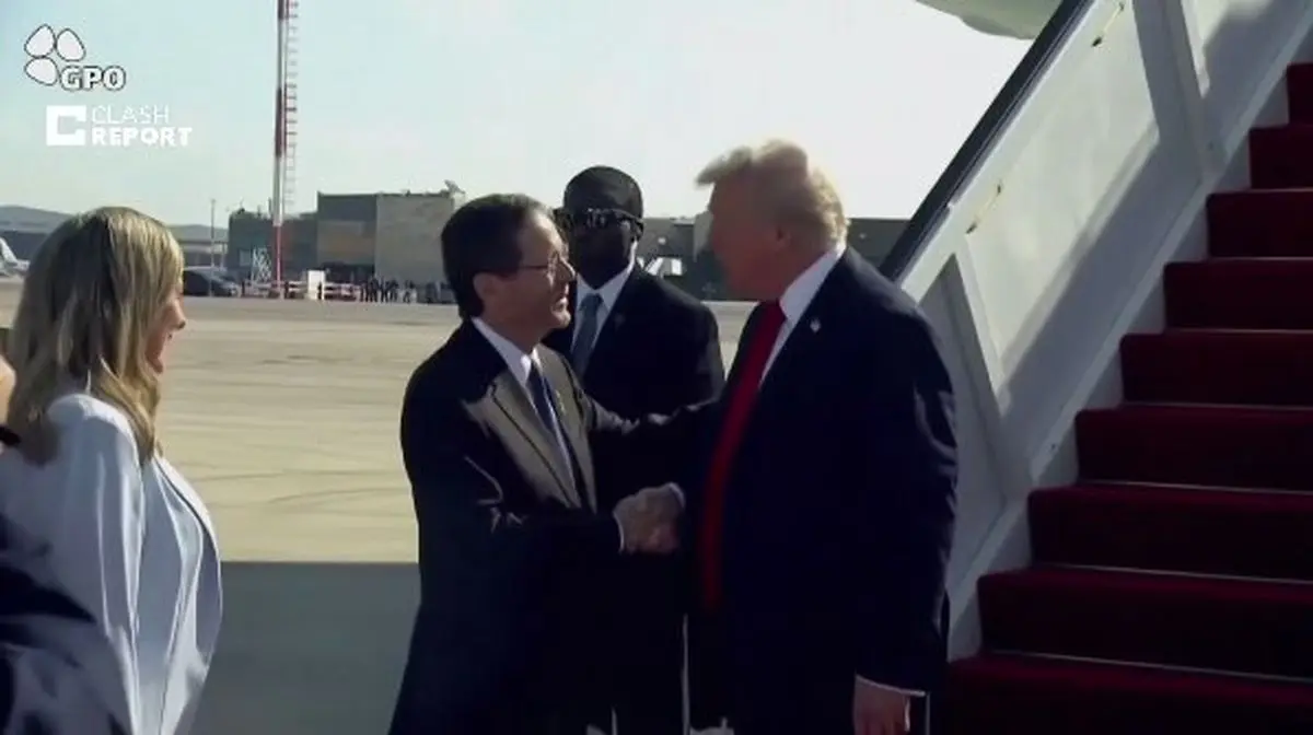 ترامپ در فرودگاه مورد استقبال «اسحاق هرتزوگ» رئیس رژیم صهیونیستی و «بنیامین نتانیاهو» نخستوزیر رژیم صهیونیستی قرار گرفت.