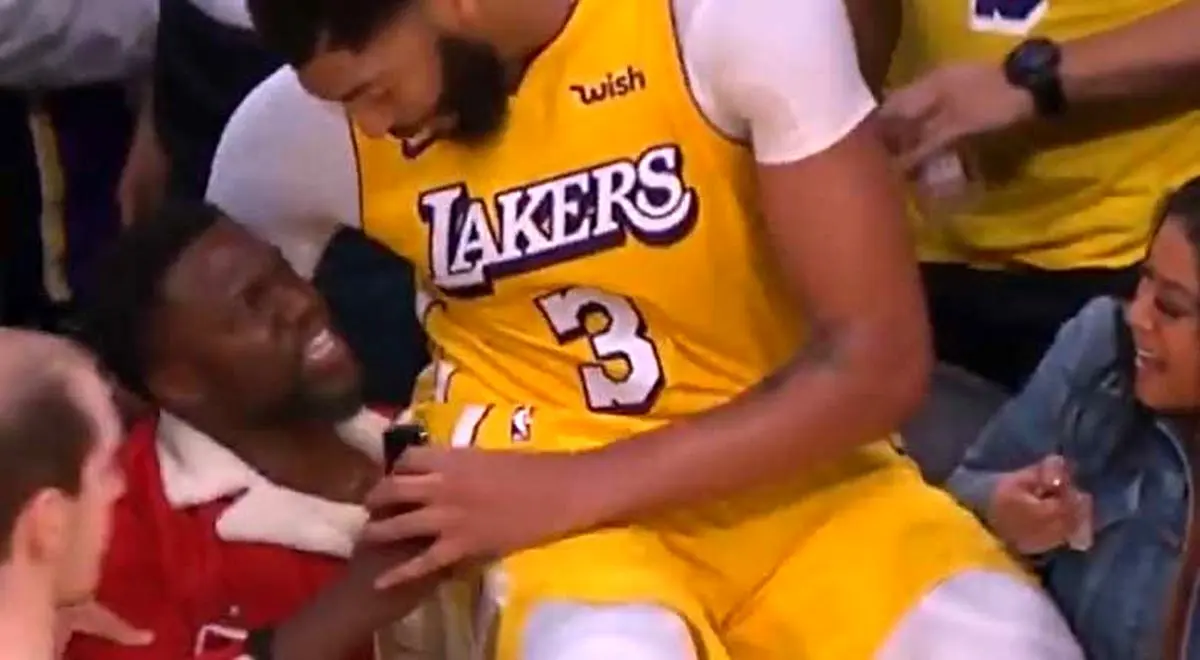 ویدیو| افتادن بازیکن بسکتبال روی بازیگر هالیوودی پارسینه: آنتونی دیویس بازیکن تیم لیکرز پس از پرتاب توپ روی کوین هارت سقوط کرد. کپی شد