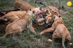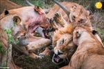 شیر نر سعی کرد تا یک گاومیش شکار شده را از دست تولهها خارج کند، اما ماده شیرها او را هدف قرار دادند.