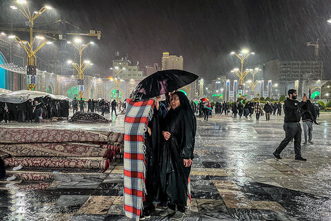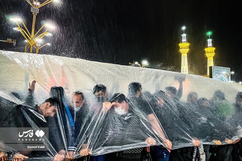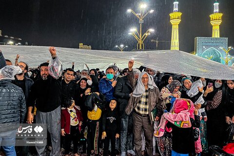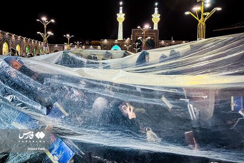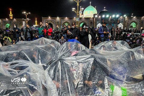 پارسینه: مراسم احیای شب بیست و یکم ماه مبارک رمضان در حرم مطهر امام رضا (ع) با بارش رحمت الهی برگزار شد و زائران حرم مطهر زیر بارش شدید باران قرآن به سر گرفتند. این تصاویر از لحظه بارش باران در مراسم شب قدر با موبایل ثبت شده اند.