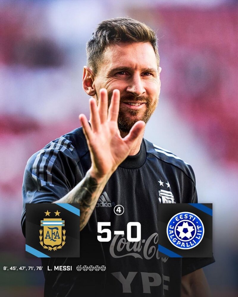 با ۵ گلی که لیونل مسی مقابل استونی به ثمر رساند به نخستین بازیکنی بدل شد که در یک دیدار از بازیهای ملی و لیگ قهرمانان اروپا، ۵ بار موفق به گلزنی میشود.