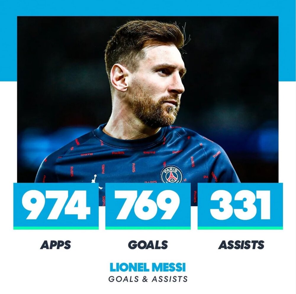 علاوه بر این، مسی در ۹۷۴ بازی در رده بزرگسالان، آمار ۷۶۹ گل و ۳۳۱ پاس گل را به ثبت رسانده است تا نخستین بازیکنی لقب بگیرد که روی ۱۱۰۰ گل تاثیر مستقیم میگذارد.