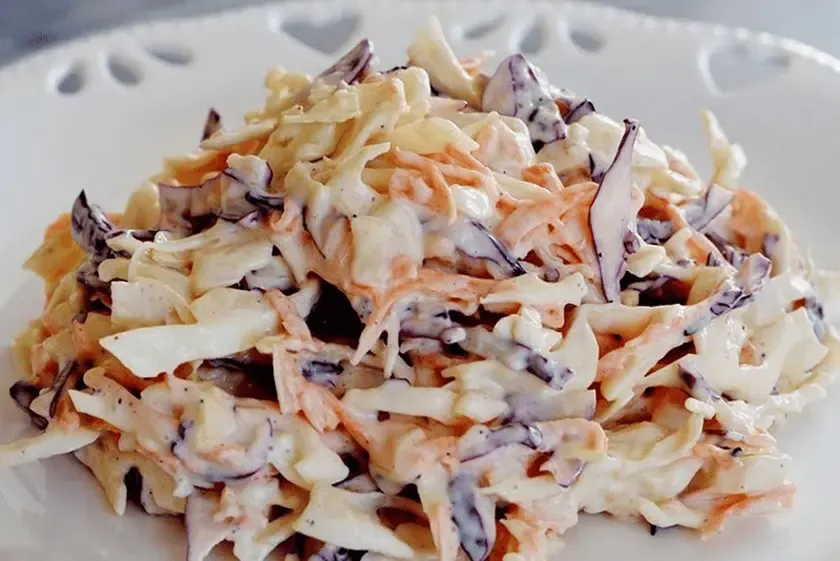 تکههای کالباس و کلم را هماندازه خرد کنید تا ظاهر سالاد زیباتر شود و طعم هر قاشق یکنواخت باشد.
